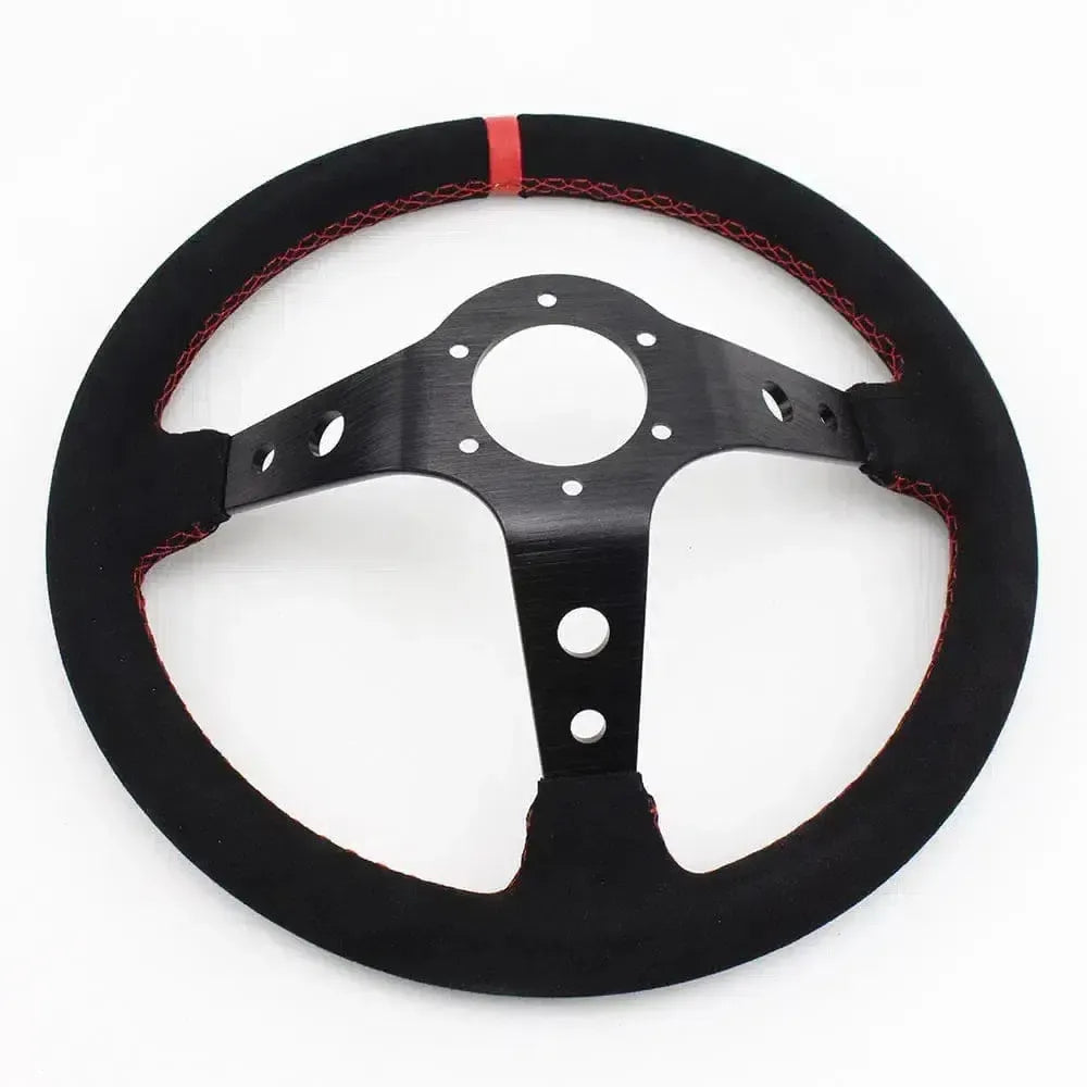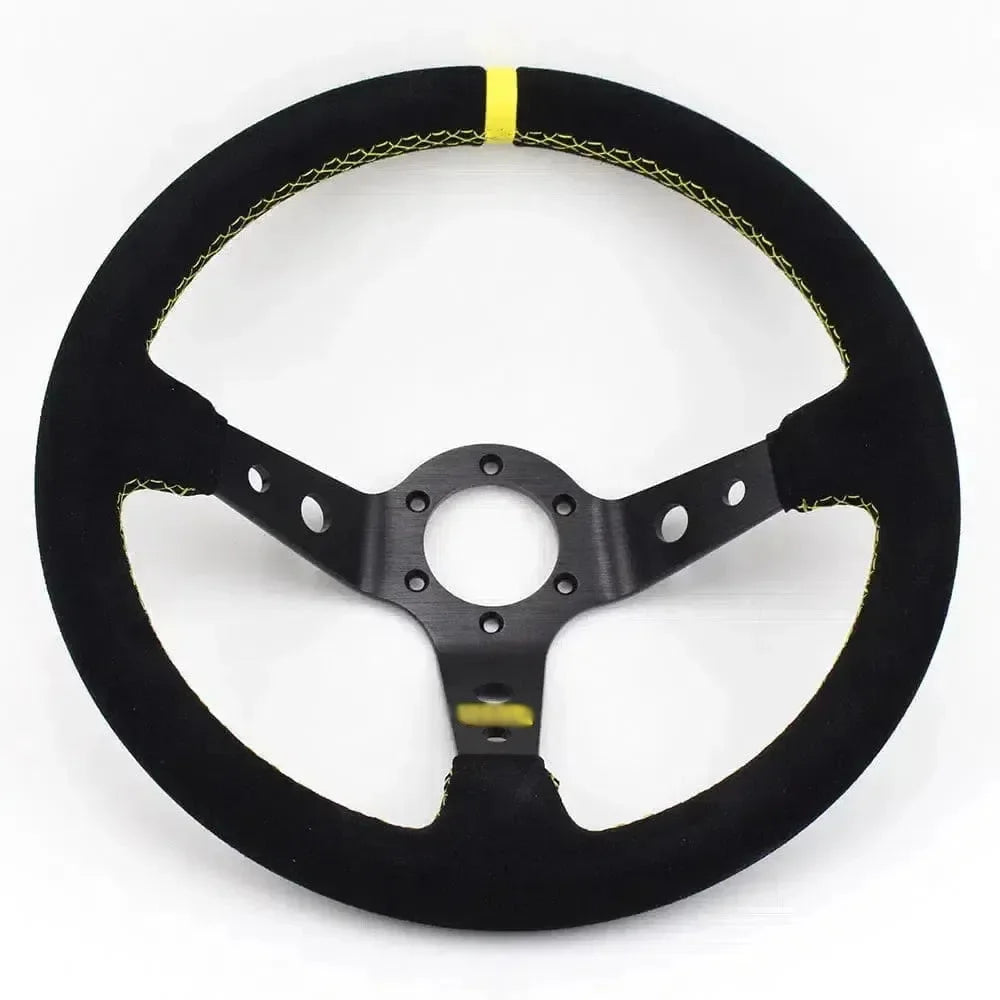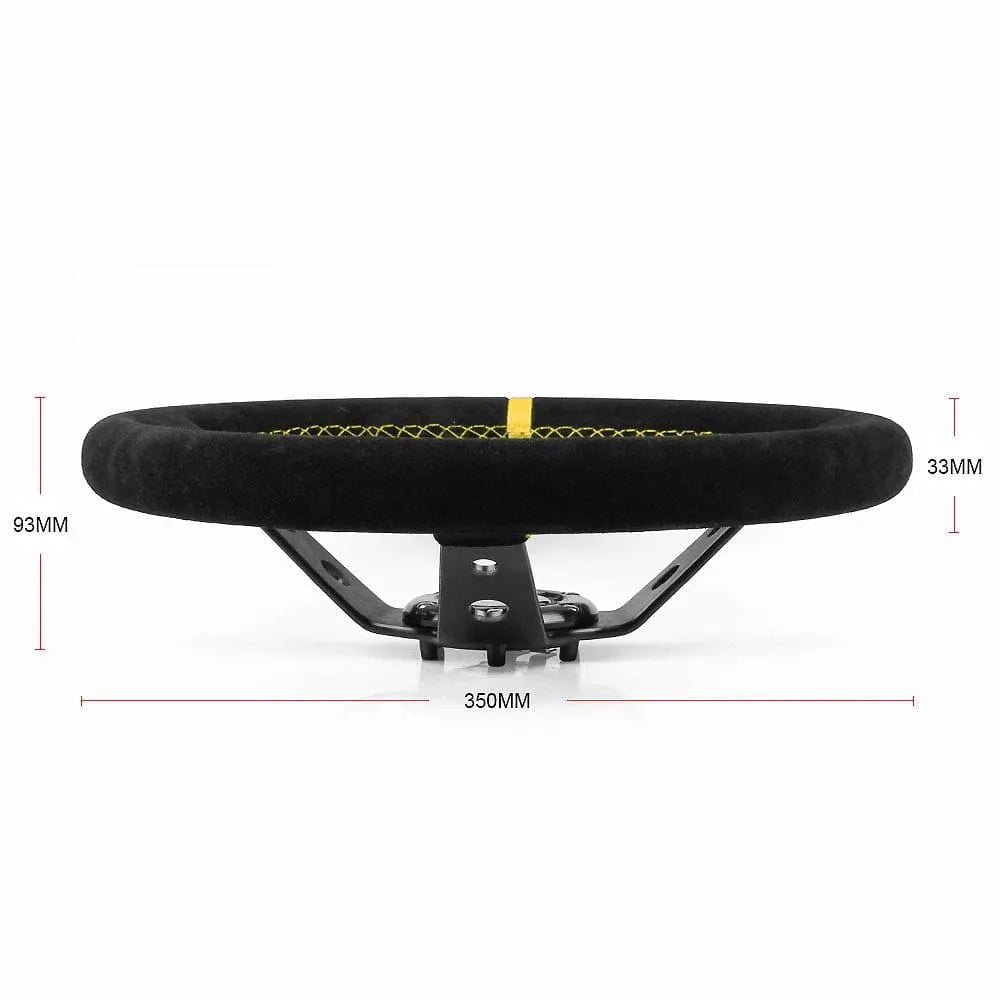 Specifications: Material: Suede and Aluminum Frame Color Options: Black, Yellow, Red, Blue Diameter: 350mm Deep Dish: 95mm Grip: Suede Wrapped for enhanced comfort and control Spokes: Lightweight and durable alloy Fitment: Standard 6 bolt, 70mm PCD compatible with most aftermarket boss kits and hubs