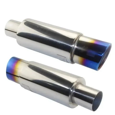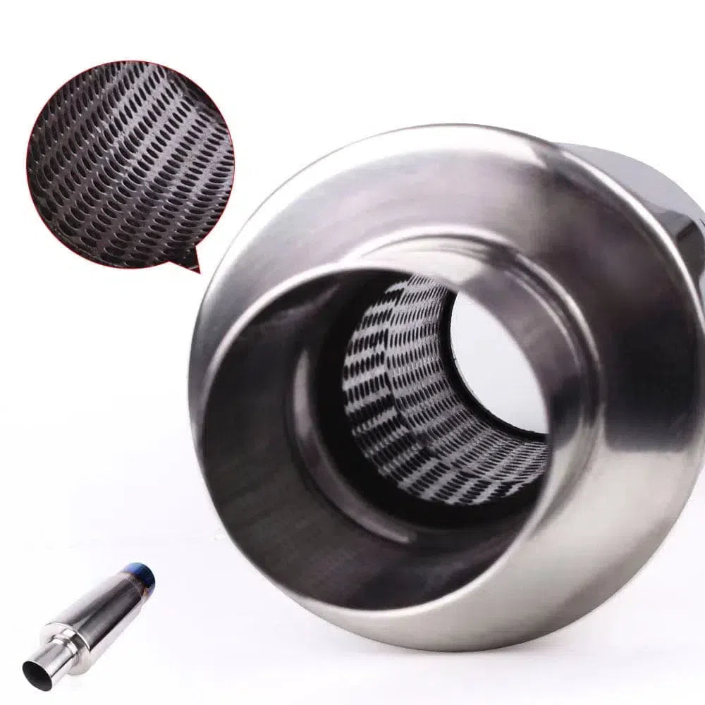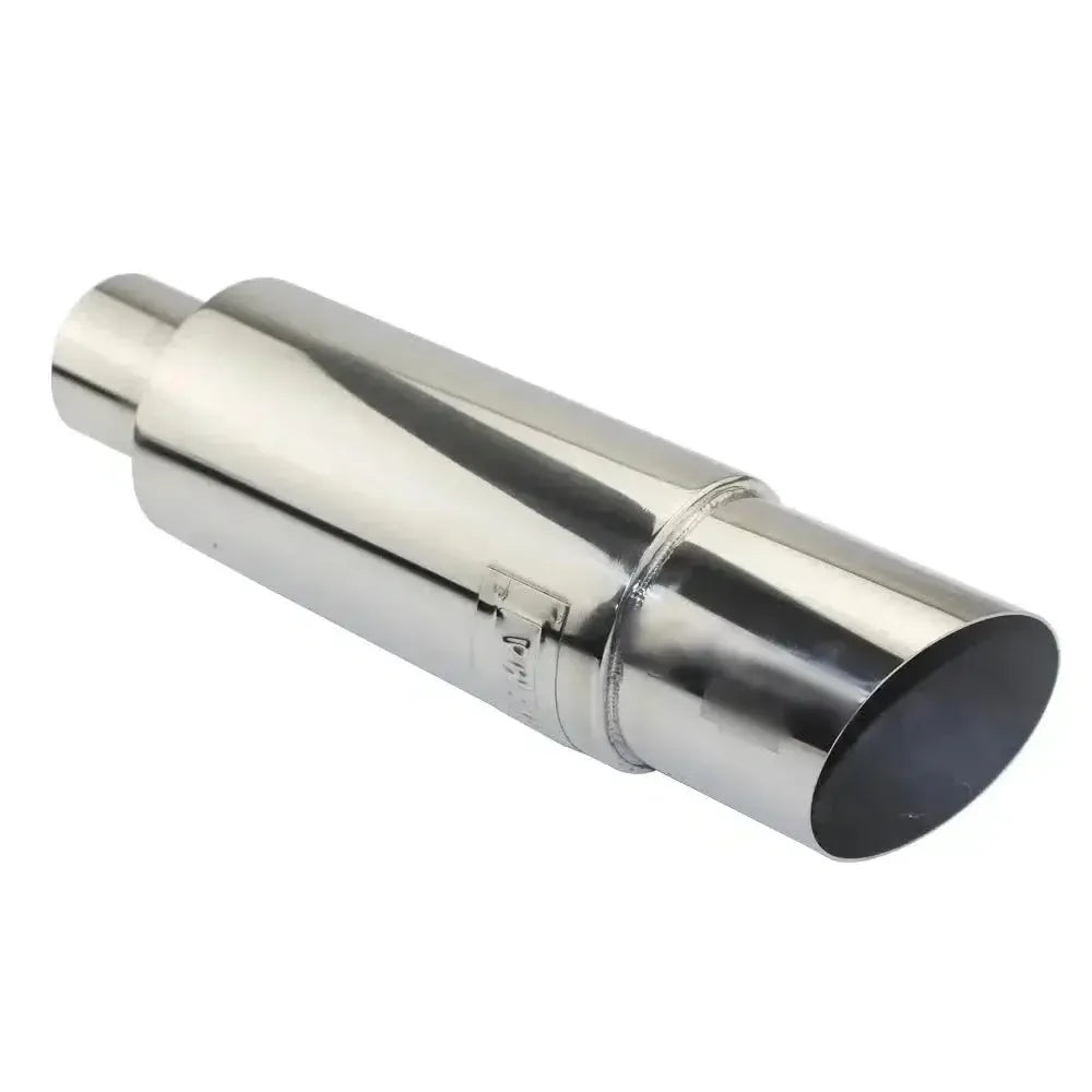 The slant drum design and 90mm (3.5") outlet boost mid-range power, torque response, and fuel efficiency. It offers potential gains in horsepower, torque, and even weight reduction. With its polished finish and TIG CNC welding, the muffler combines functionality with a sleek aesthetic. The universal fit accommodates inlet sizes of 51mm, 57mm, and 63mm, making it versatile for a wide range of vehicles.
