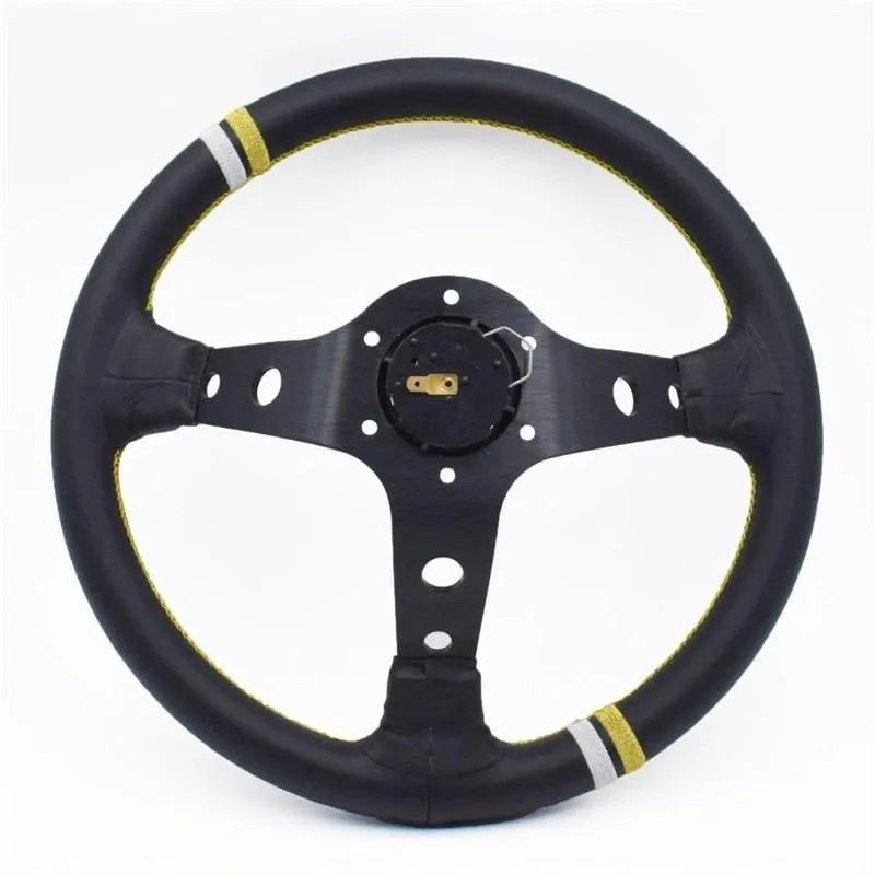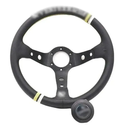 Elevate your driving comfort and control with the package content including 1 x Steering Wheel, 1 x Horn Button & Cover, horn wire, and screws. The sleek black leather design combined with the modified deep dish shape adds a touch of sophistication to your vehicle's interior.